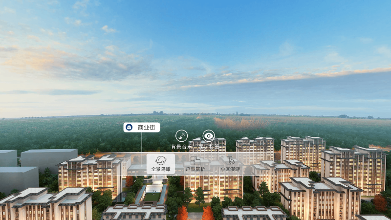 - 全景鸟瞰:使用VR手柄点击“显示标签”,可在鸟瞰图中显示和隐藏相关标签:商业街、健身慢跑道、休憩空间、庄园配套幼儿园。