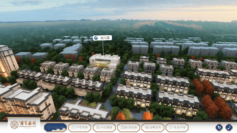 - 全景鸟瞰:可从庄园中央位置鸟瞰庄园全景,可以看到附近的商业街、健身慢跑道、休憩空间、庄园配套幼儿园。对庄园的布局和大小有个大致的了解。