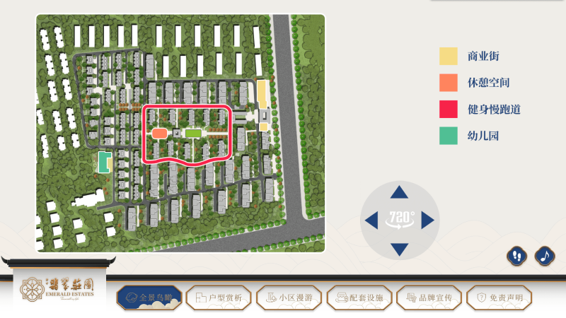 - 全景鸟瞰:在小屏的下方菜单栏中点击“全景鸟瞰”,大屏中会显示定位于庄园中央位置鸟瞰庄园全景,可以看到庄园的商业街、健身慢跑道、休憩空间、庄园配套幼儿园??啥宰暗牟季趾痛笮∮懈龃笾碌牧私?。如需要操控观察方向,可在小屏中的“720°”按钮上点击4个方向的三角形控制,同时小屏上提供彩平图以4中颜色分别划分出4个功能空间的大小,让用户能直观了解到这4个功能空间在庄园中的位置。