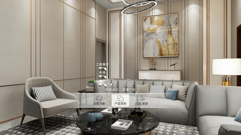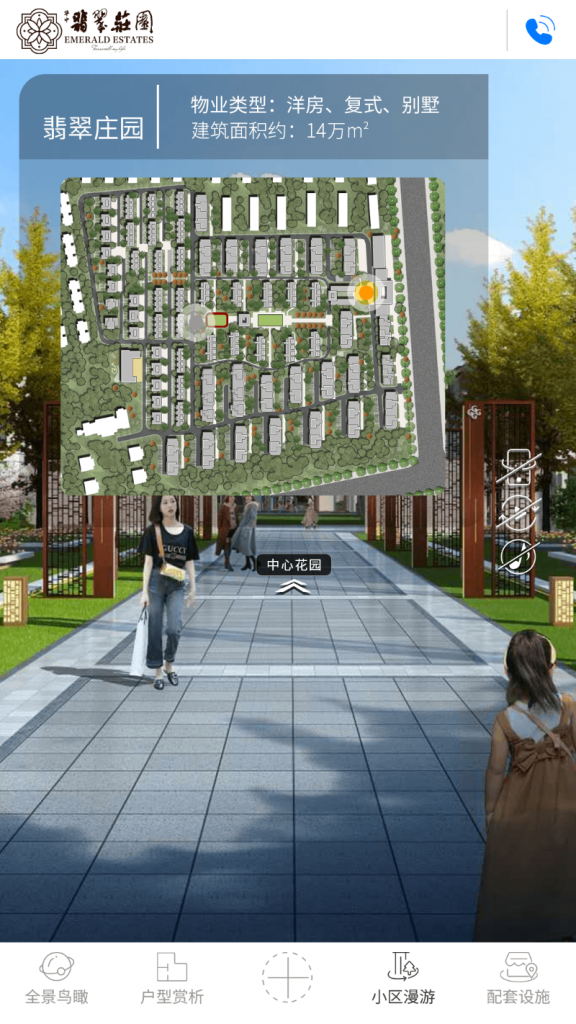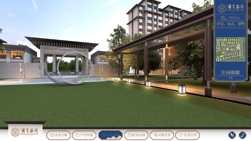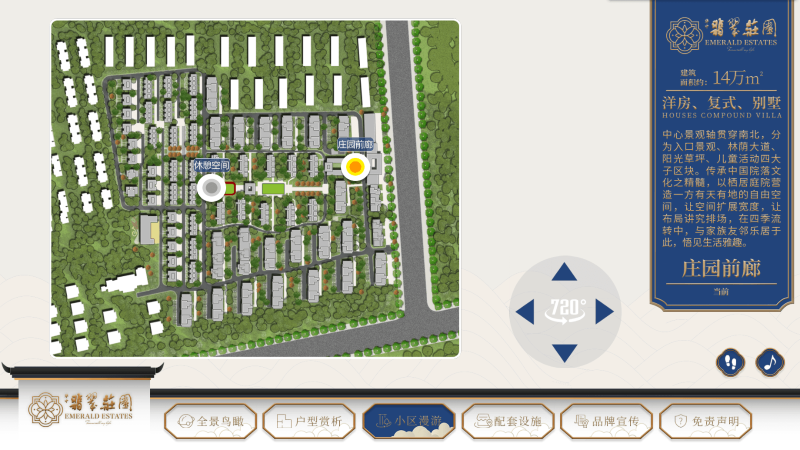 - 小区漫游:在小屏的下方菜单栏中点击“小区漫游”,以常规高度在庄园前廊与休憩空间前后两个位置观察庄园的布局,了解庄园的公共空间。在小屏的庄园彩平图上点击点位,大屏同时会跳转到相应的公共空间中。