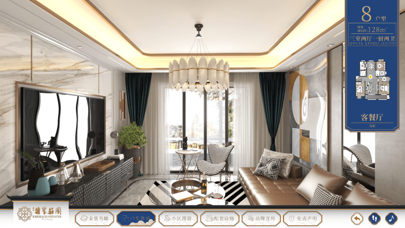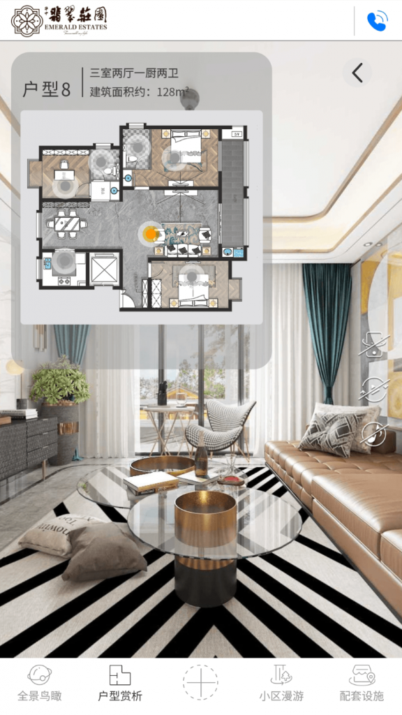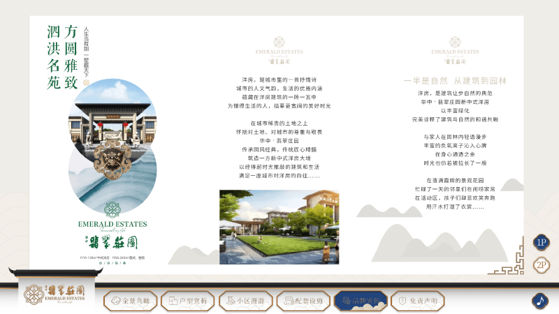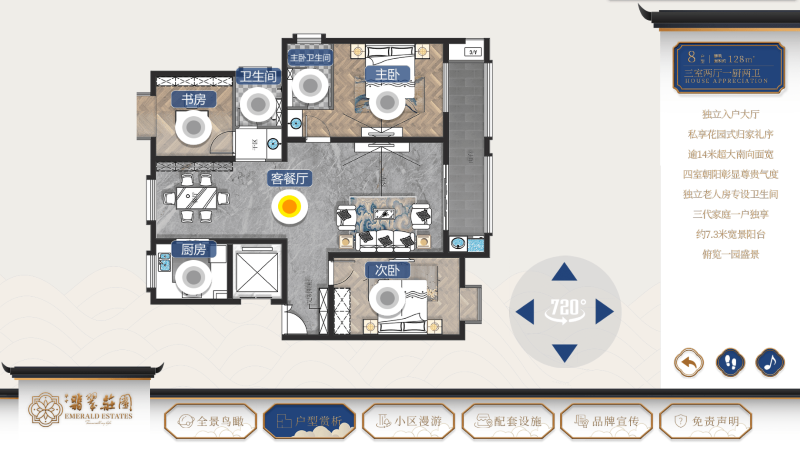 - 户型赏析:进入该功能首先出现户型选择弹框,可直接在弹框中了解所介绍的房型在庄园中的大致分布。详细介绍了房型的结构和建筑面积,以及彩色户型图。点击弹框中的“关闭”按钮后,即可进入相对应的房型全景图,通过点击相应的房间热点,如“客厅”,可前往同层的客厅,“二楼餐厅”,可前往二楼餐厅房间,来实现不同房间的切换。