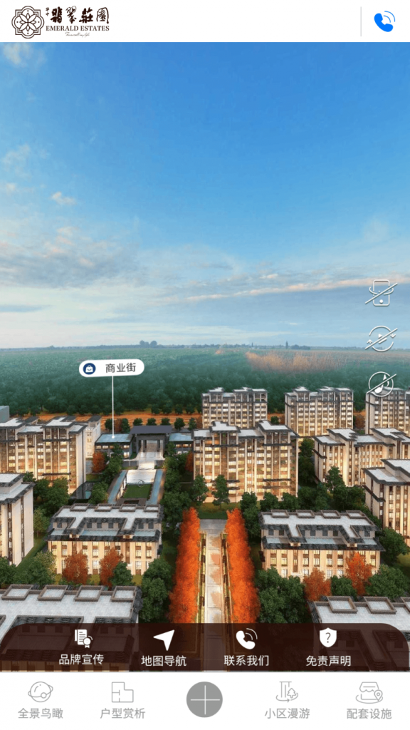H5版本功能有:全景鸟瞰、户型赏析、小区漫游、配套设施、品牌宣传、地图导航以及免责声明。