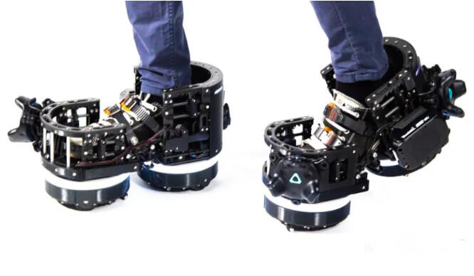 据介绍,所述的机械靴采用了特殊的机械设计,前后两半通过一个可伸缩的活动装置进行链接,而底下则通过4个马达来实现微滑转,从而产生一种实际保持在原地但却能在VR中不断行走的错觉。另外,设备搭载了两个Vive追踪器,从而实现精确的移动对准。