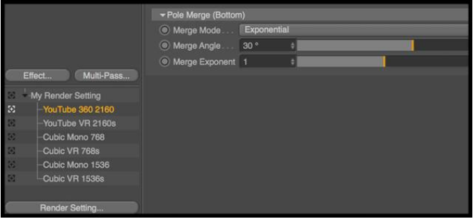 (3)创建CV-VR Cam渲染设置:在菜单栏中找到Plugins,选择CV-VR Cam插件,Create Render Setting。打开渲染设置,这里有两种渲染设置可供选择,一种是单眼360度视频,另一种则是区分左右眼的VR立体模式,两种模式都能够完成VR视频的渲染。这里选择YouTube 360 2160模式进行渲染;