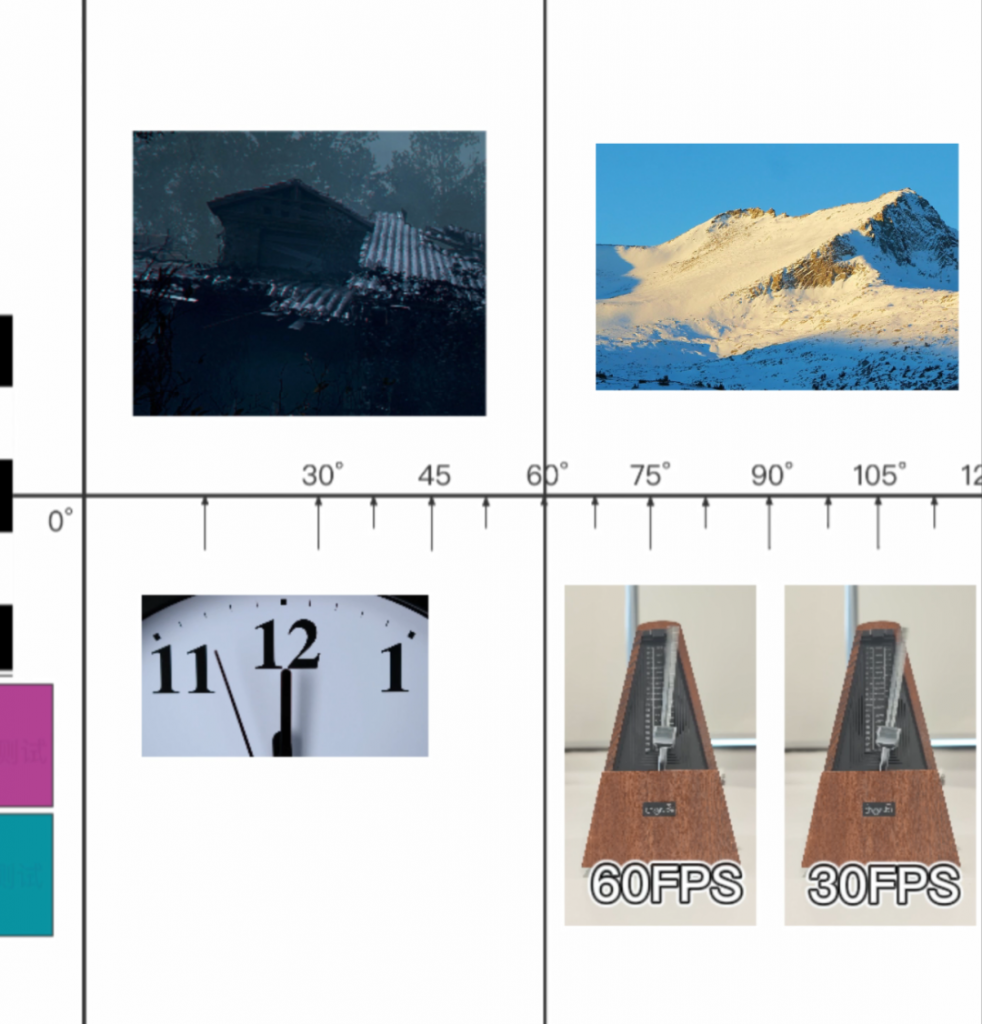 考虑到市面上的VR一体机并不能很好的支持8k视频,所以视频分辨率为3840*1920。我们可以通过截图和实际播放的方式,用来评估播放器,VR一体机,编解码,画质增强算法的画质表现。通过这个视频,我们可以测试FOV,清晰度,帧率及流畅性,色彩区分度,亮度表现,色散这些维度。