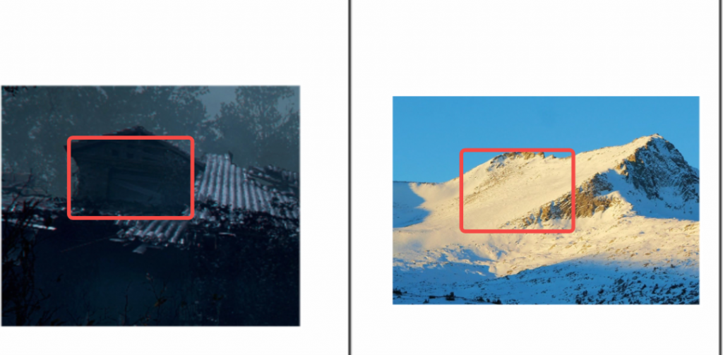 我们通过一张夜景图片来测试暗区细节,一张阳光下的雪山图片测试亮区细节。暗区图片可以看到木条等细节,亮区可以看到雪的纹理,细节等。如果可以看清红框内的纹理细节,而不是死黑和过曝。则说明屏幕亮度参数,gamma,渲染表现较好。