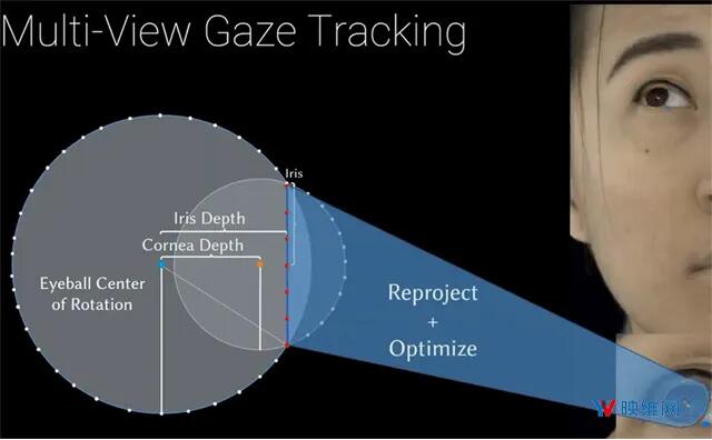 对于每一帧,团队利用检测器在多个不同的输入视图中沿着边缘检测关键点,然后沿着边缘将关键点重投影至多视角图像,并优化每一帧的眼球位置和方向以匹配关键点。这样就可以为每个序列拟合一个几何眼睛模型,包括每帧对每个眼睛方向的估计。对于几何眼睛模型,团队将其定义成由两个球体组合的曲面,围绕边界线性混合。